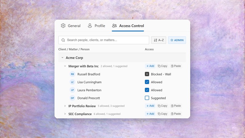 How per-matter user lists, intelligent suggestions, and ethical wall integration make enterprise-wide AI deployment possible without compromising confidentiality.